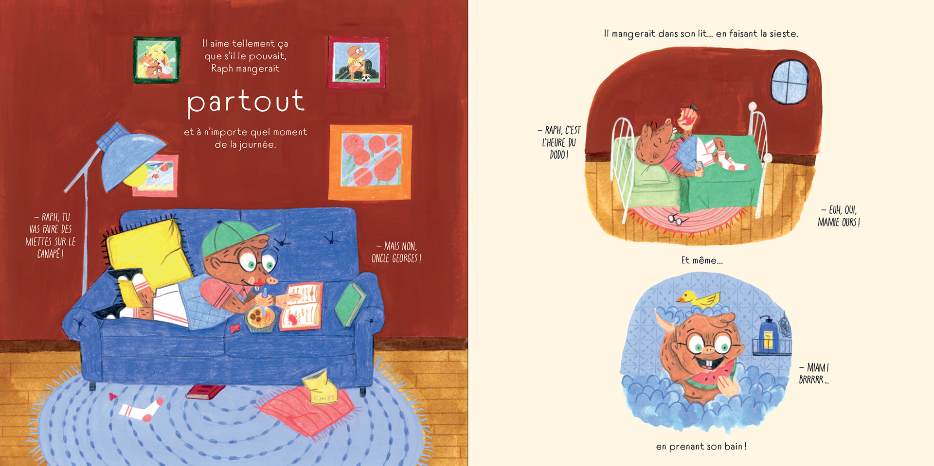Raph adore manger. Le spaghetti de mamie Ours, bien sûr, mais aussi les crêpes aux bananes, la pizza toute garnie sans champignons, et bien sûr, toutes les sortes de gâteaux de l’univers. Mais le brocoli ? Non. Non merci. Jamais. Quand Oncle Georges déclare : « Ce soir, je ne fais pas ma soupe spéciale, on va au restaurant ! », Raph saute de joie. Jusqu’à ce qu’il découvre… le menu ! Du. brocoli. PARTOUT. Heureusement, Louise la cheffe cuisinière l’invite à enfiler un tablier et à tenter l’impossible.