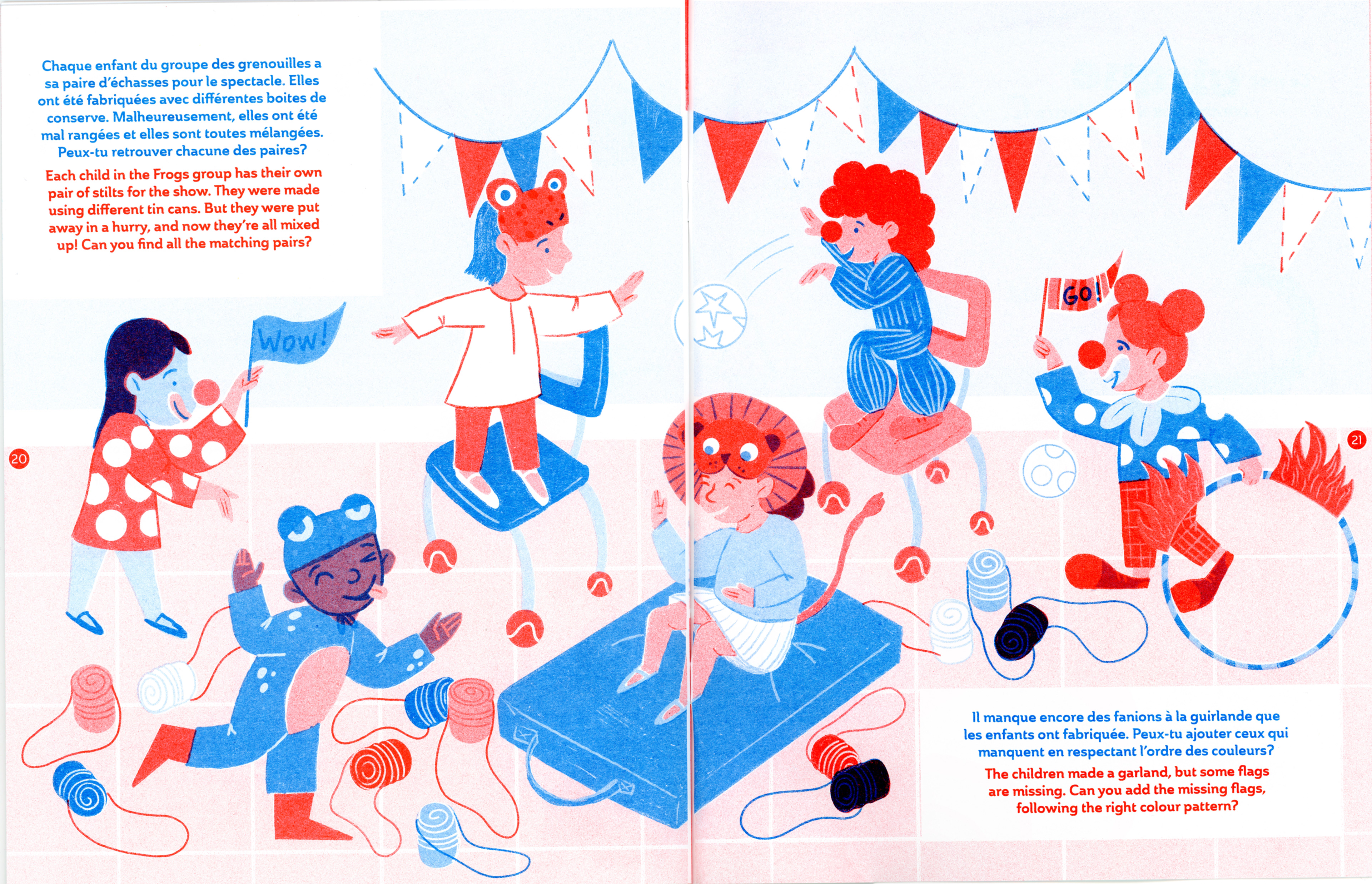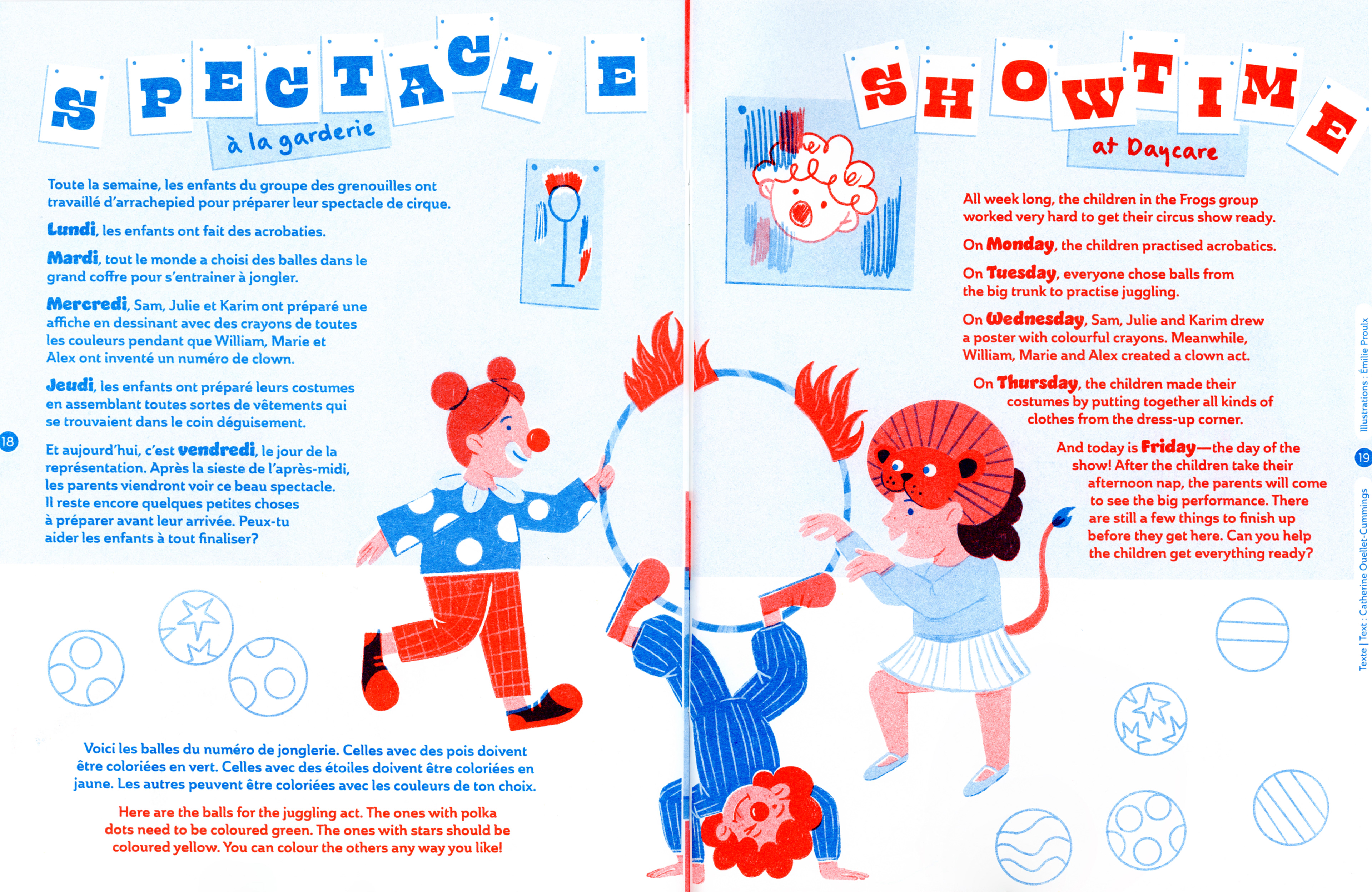 Illustrations deux couleurs réalisé pour le Magazine Grilled Cheese no 24, cirque, texte écrit par Catherine Ouellet-Cummings. Le magazine Grilled Cheese est un magazine bilingue imprimé en risographie.